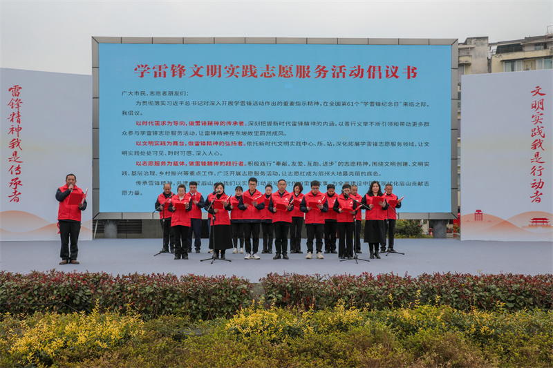 “以时代需求为导向,做雷锋精神的传承者……”近日,在眉山市暨东坡区“学雷锋·文明实践我行动”主题活动启动仪式现场,身穿红马甲的文明实践志愿者代表们发起了学雷锋倡议。这一倡议得到了现场群众的积极响应,不少人现场咨询注册志愿者事宜,争做雷锋精神的传承者、弘扬者、践行者。
