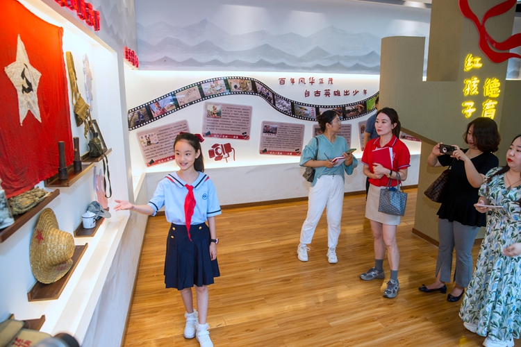 7月25日,湖北省宜昌市实验小学“红领巾讲解员”肖菡西同学为采访报道组介绍“红孩子”德育加油站的陈设。新华网 钟奕 摄