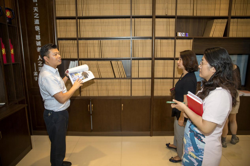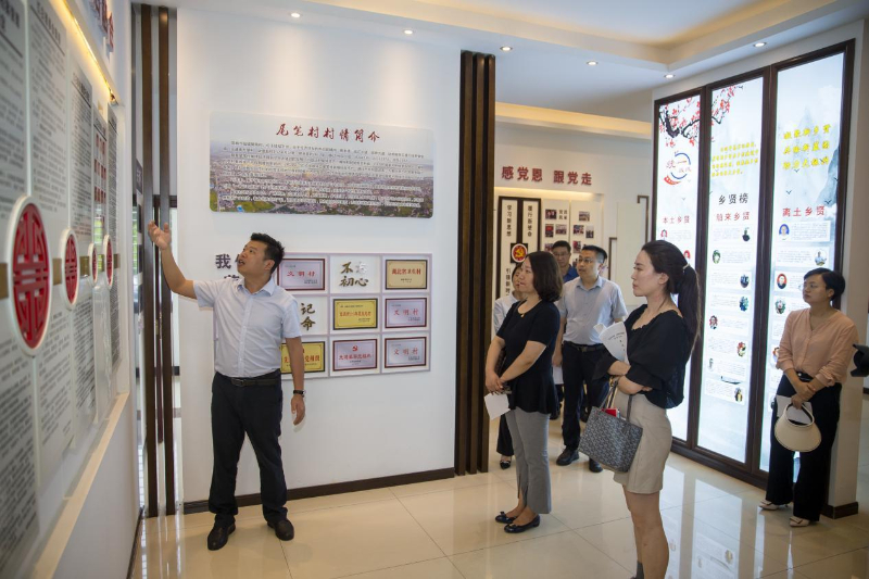 7月25日,湖北省宜都市五眼泉镇鸡头山村村委会工作人员李玉兰为采访报道组介绍鸡头山村家风家训陈列馆的主题内容。新华网 钟奕 摄
