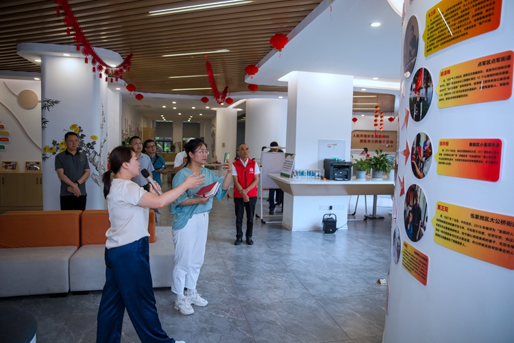 7月25日,湖北省宜昌市伍家岗区大公桥街道金家台社区居委会的工作人员在为采访报道组介绍志愿者陈实的工作事迹。新华网 钟奕 摄