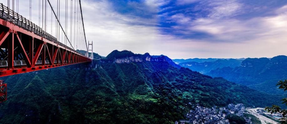 7月17日,在湖南省湘西土家族苗族自治州吉首市矮寨镇附近拍摄的G65高速公路矮寨大桥,右下为矮寨镇。新华网 钟奕 摄(14张照片拼接)