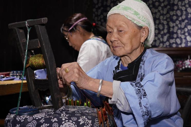 7月16日,湖南省湘西土家族苗族自治州凤凰县竹山村村民龙妹叭向游客展示编花带技艺。新华网 钟奕 摄