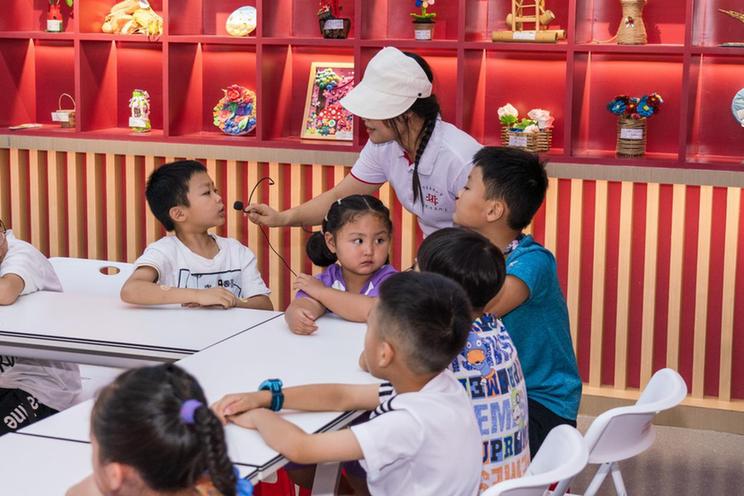 7月16日,湖南省湘西土家族苗族自治州吉首市新时代文明实践中心举办的垃圾分类志愿服务小讲堂,志愿者正在向小朋友们讲述垃圾分类的规则。新华网 钟奕 摄