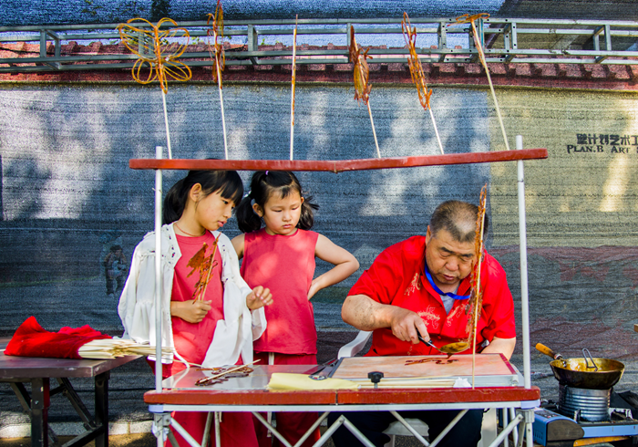 资料图:在东达沟村,小朋友们正在观看非遗糖画的制作。(包头市委宣传部供图)