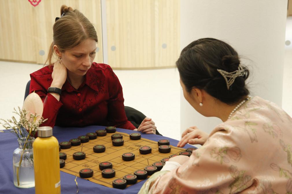 4月20日,在挪威首都奥斯陆,当地民众在中文日庆祝活动上体验中国象棋。新华社记者张玉亮 摄