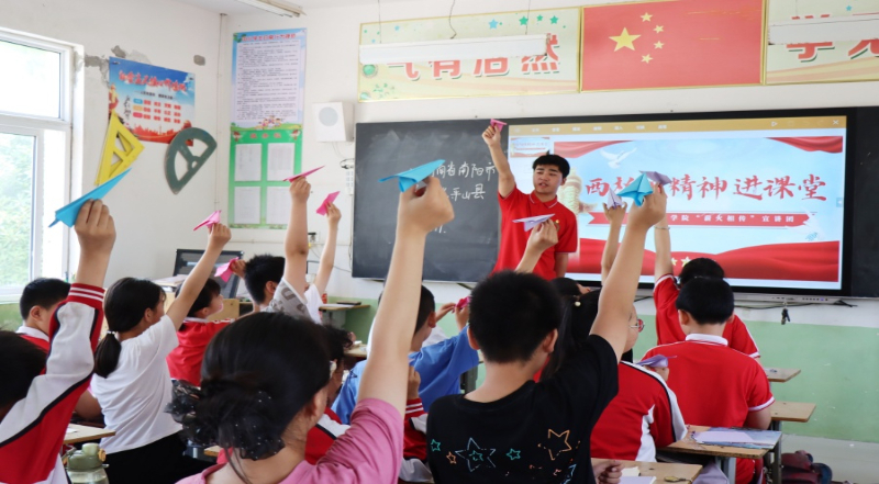 南阳市大学生志愿者走进宛城区乡村学校少年宫开展红色教育实践活动。南阳市文明办 供图
