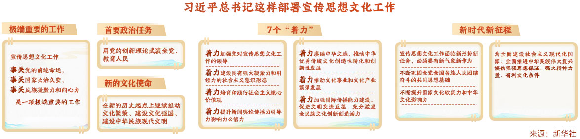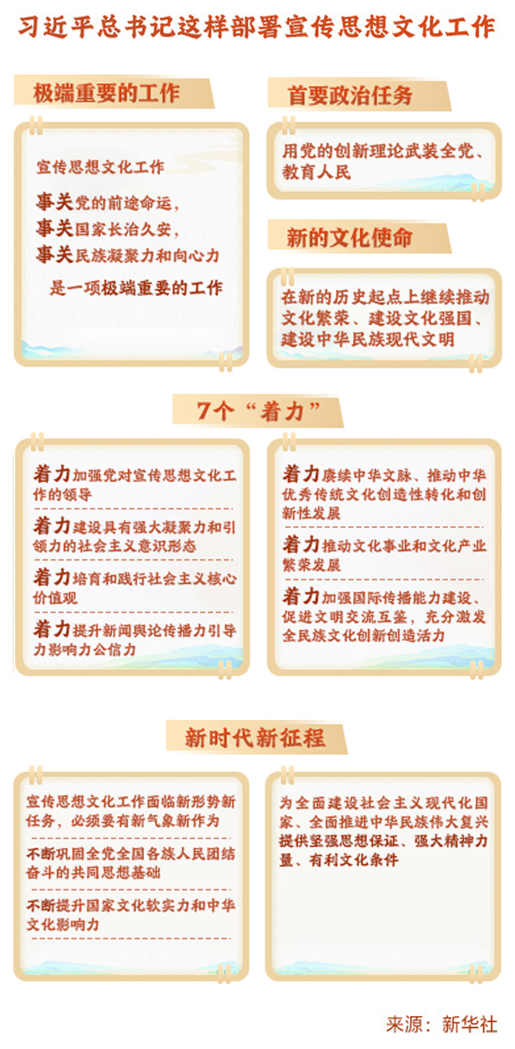 10月7日至8日,全國宣傳思想文化工作會議在京召開。會議傳達了習(xí)近平總書記對宣傳思想文化工作的重要指示,并首次提出習(xí)近平文化思想。習(xí)近平:堅定文化自信秉持開放包容堅持守正創(chuàng)新 為全面建設(shè)社會主義現(xiàn)代化國家全面推進中華民族偉大復(fù)興提供堅強思想保證強大精神力量有利文化條件。